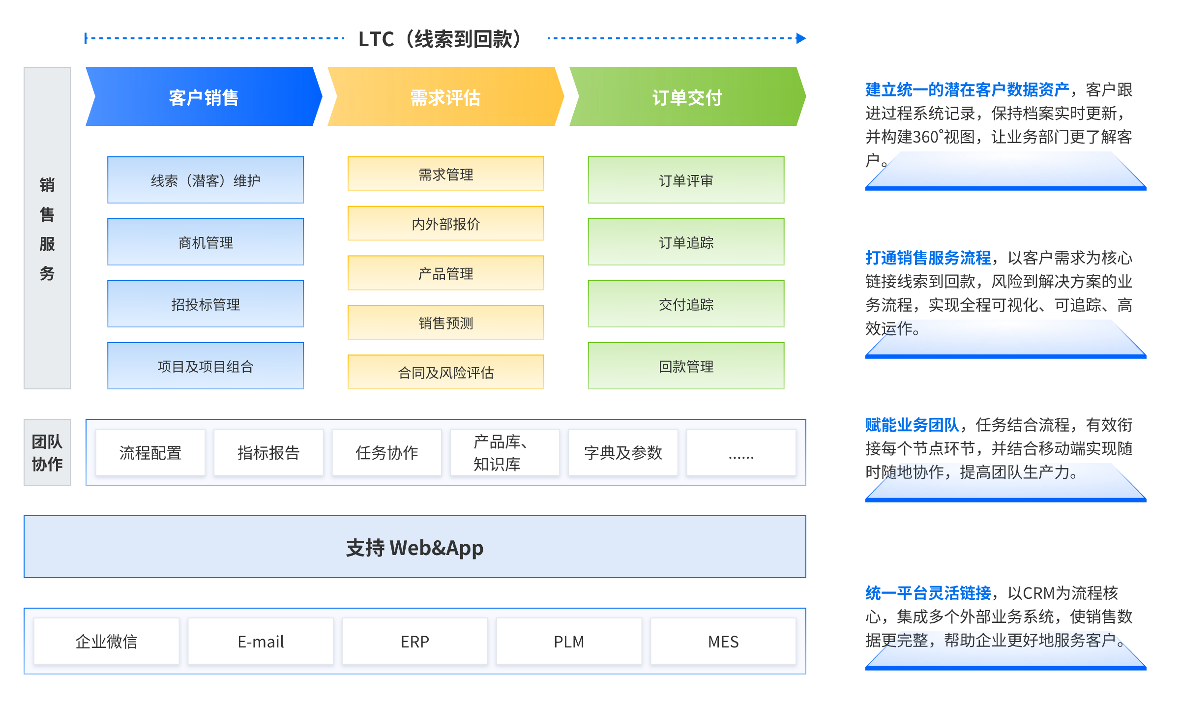 打通從銷售線索、商機、項目管理、方案設計、報價、交付、回款等業務環節,設計研發了儲能行業LTC平臺解決方案。